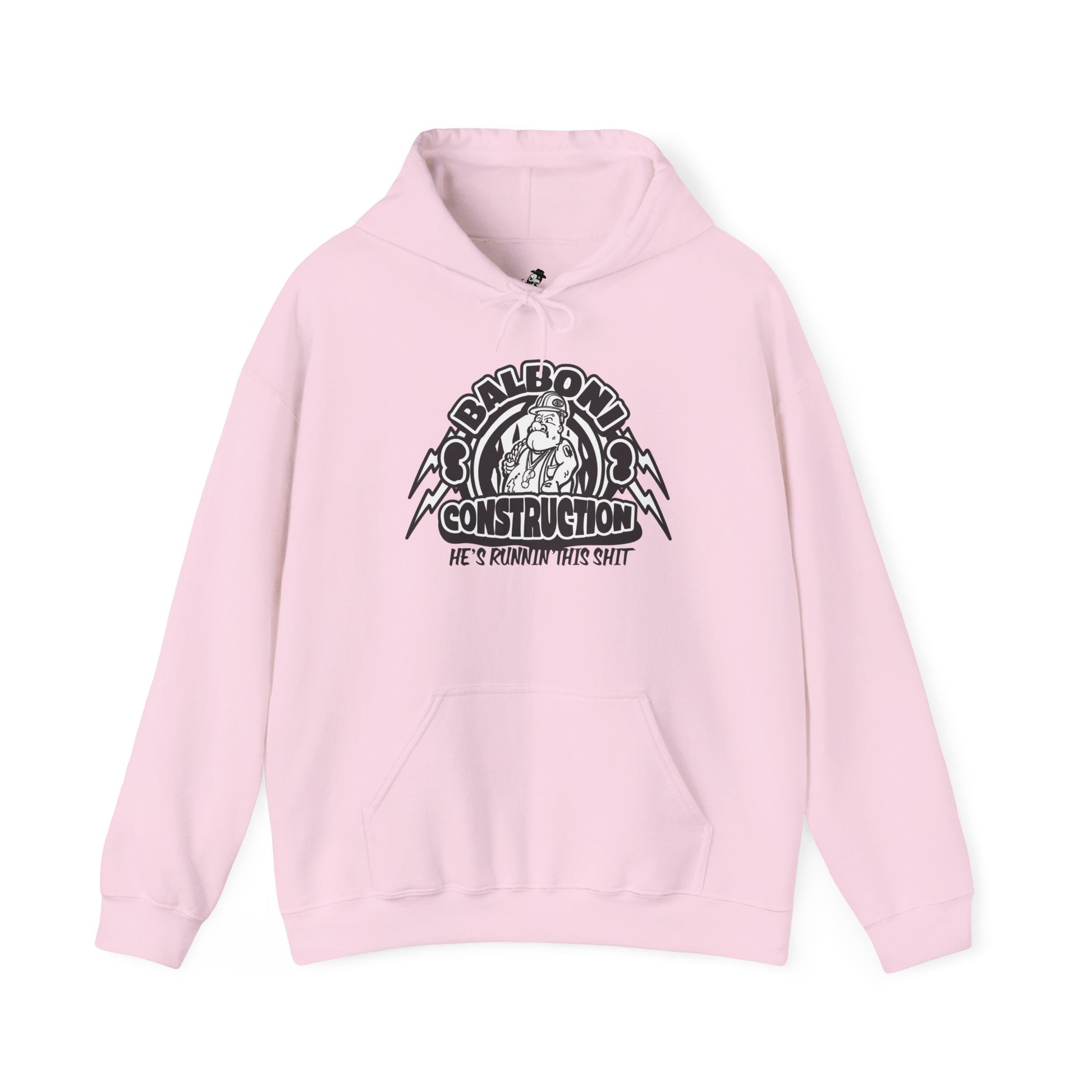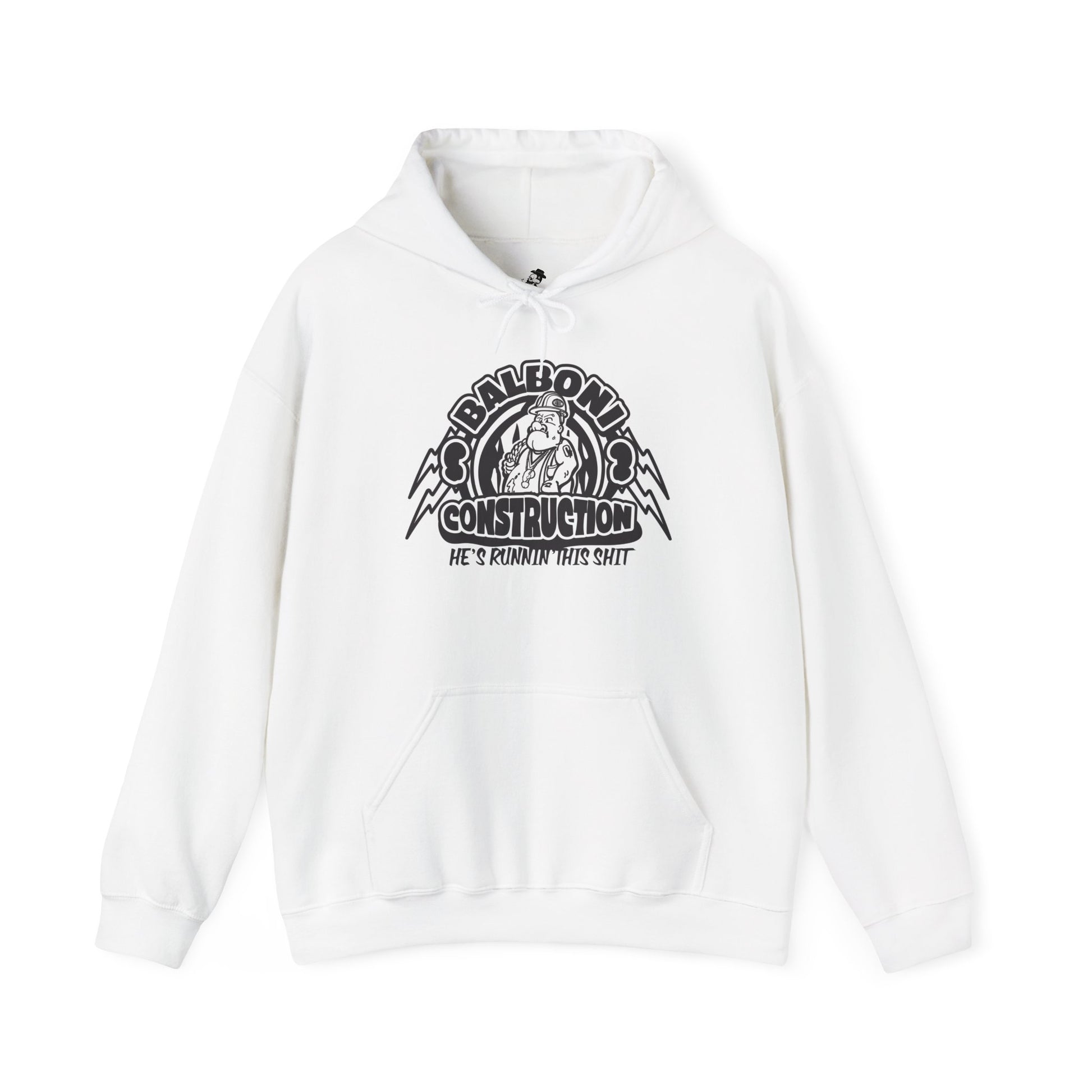 Steve Balboni Construction Company hoodie crafted from a sturdy cotton-polyester blend, it offers a soft feel and cozy warmth that make it perfect for chilly days. The spacious kangaroo pouch pocket keeps your hands warm and adds functionality. With an adjustable drawstring hood.